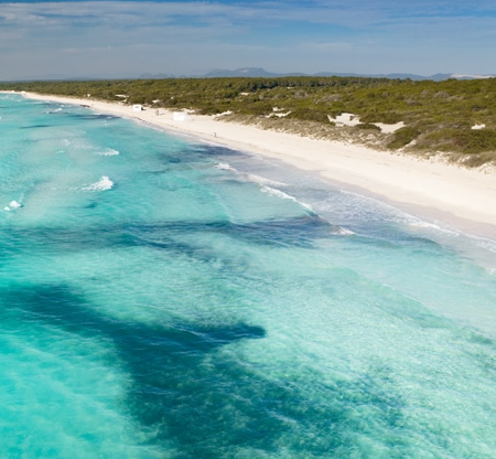 Immagina di essere catapultato in una vera e propria "spiaggia caraibica di Maiorca", dove l'acqua cristallina si tuffa in tonalità di azzurro infinito e la sabbia bianchissima fa da contrasto perfetto.